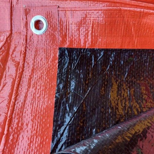 Тент представлений у чорно/померанчовому кольорі. Подвійна клейова смужка посилює края тента, а металеві люверси по периметру дозволяють використовувати шнур або мотузку для закріплення.